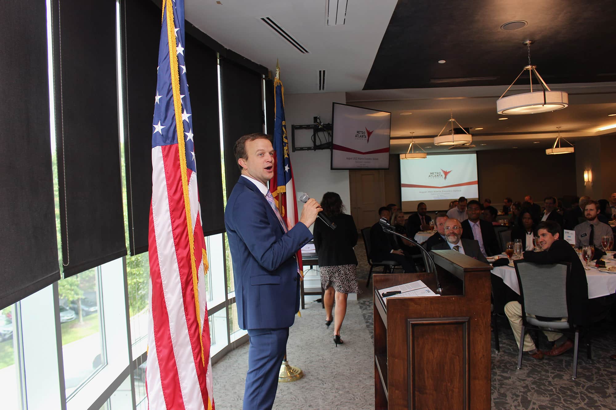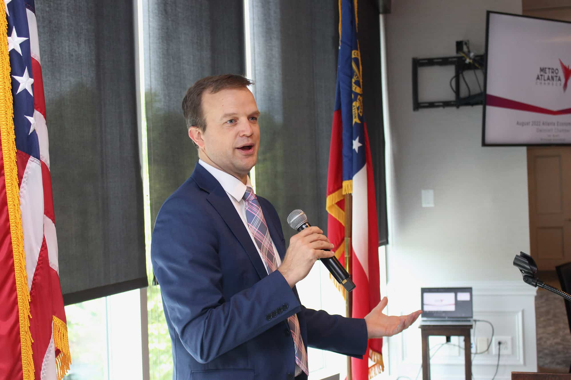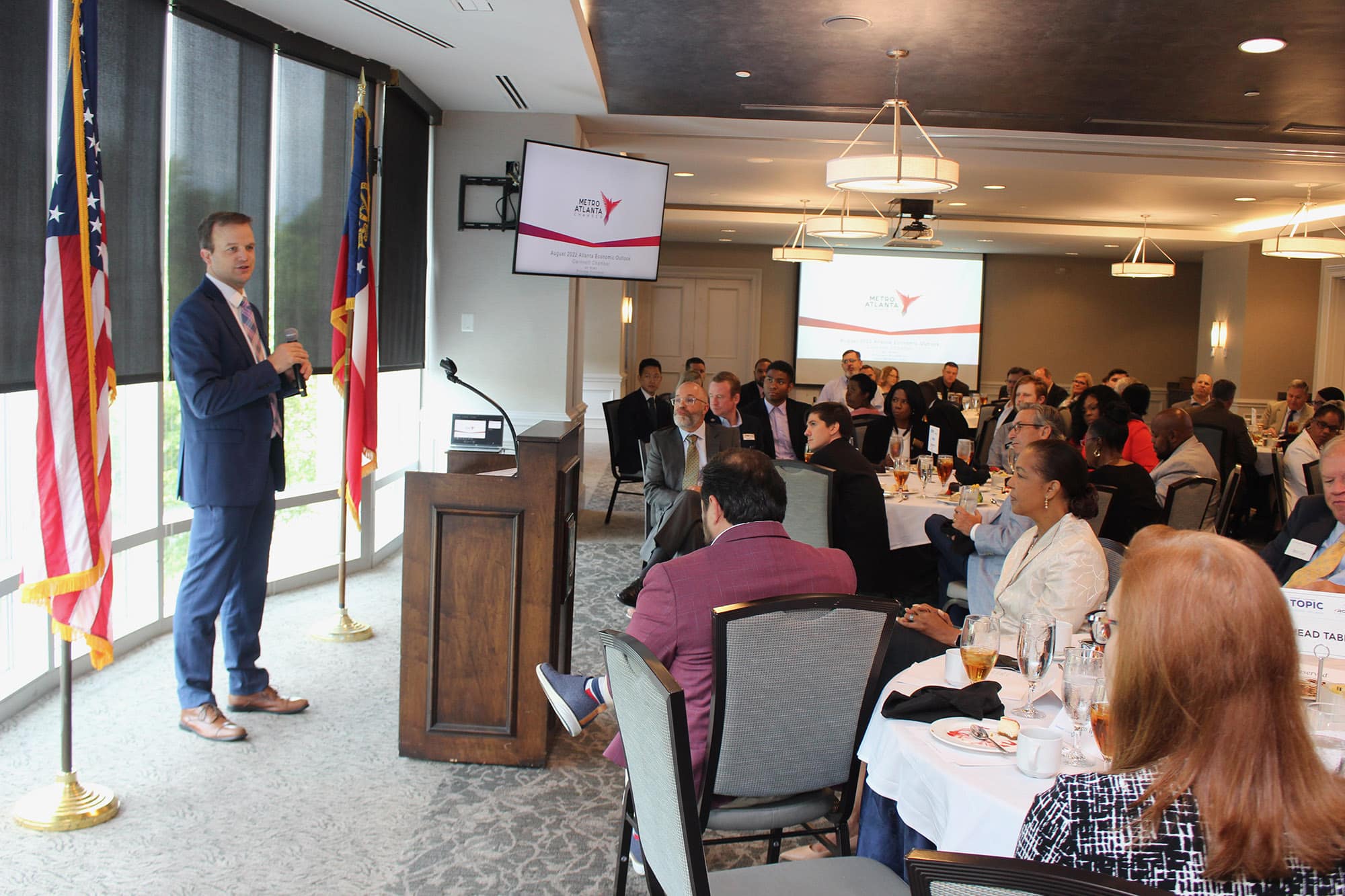 “The big picture is looking good for metro Atlanta,” stated Ian Wyatt, Vice President and Principal Economist for the Metro Atlanta Chamber. Wyatt, who was named the Chamber’s Principal Economist exactly one year ago this month, brought the facts and figures to support a strong macro-economic forecast for greater Gwinnett and the Atlanta region at the Gwinnett Chamber On Topic luncheon presented by Rocket IT. Remember, however, that a forecast is just that, an educated projection of a thing based on current trends and data. Wyatt would want everyone to know this before reading any further. With disclaimers out of the way, Wyatt shared some good news on the unemployment front highlighting that metro Atlanta’s rate was currently 3.2%, better than most major metro cities. To add, the market and talent pool in Atlanta is growing as population increases. And according to the Atlanta Regional Commission’s (ARC) latest population report, Gwinnett is leading the way. What Wyatt added to that picture is that Gwinnett is not just leading the region in this area but is also outpacing the national average by two-and-a-half times the rate of growth. Though labor force is clearly growing by leaps and bounds, other aspects of the region’s economy are not keeping pace. Wages, for example, have fallen behind national averages. Inflation over the last year has increased but remained flat in this last month. And supply chain issues and disruptions continue to abound in a post-covid economy. On a national scale, the GDP reported negative growth over the last two quarters, but Wyatt shared that he doesn’t believe that we are in a recession. Warehousing construction paves the way in the Southeast with 10% of all industrial construction in the U.S. being done in thirty-three counties along I-85 in Georgia, South Carolina, and North Carolina. Our ports remain strong, and the Atlanta region continues to maintain its powerhouse economic position for being centrally located to reach more than three-fourths of the nation’s population. With each economic pivot, downturn or boom, the ability to identify and harness innovative opportunities has driven economic solution. Recent billion-dollar investments like Hyundai, Rivian, and SK Battery, suggest that the electric transportation industry is that next innovative opportunity for Georgia. From supply chain, warehousing, manufacturing, and distribution, Waytt shared that the market is on our doorstep. The labor force and cost-of-living are ample and attractive. And the macro picture for metro Atlanta is, indeed, very bright.